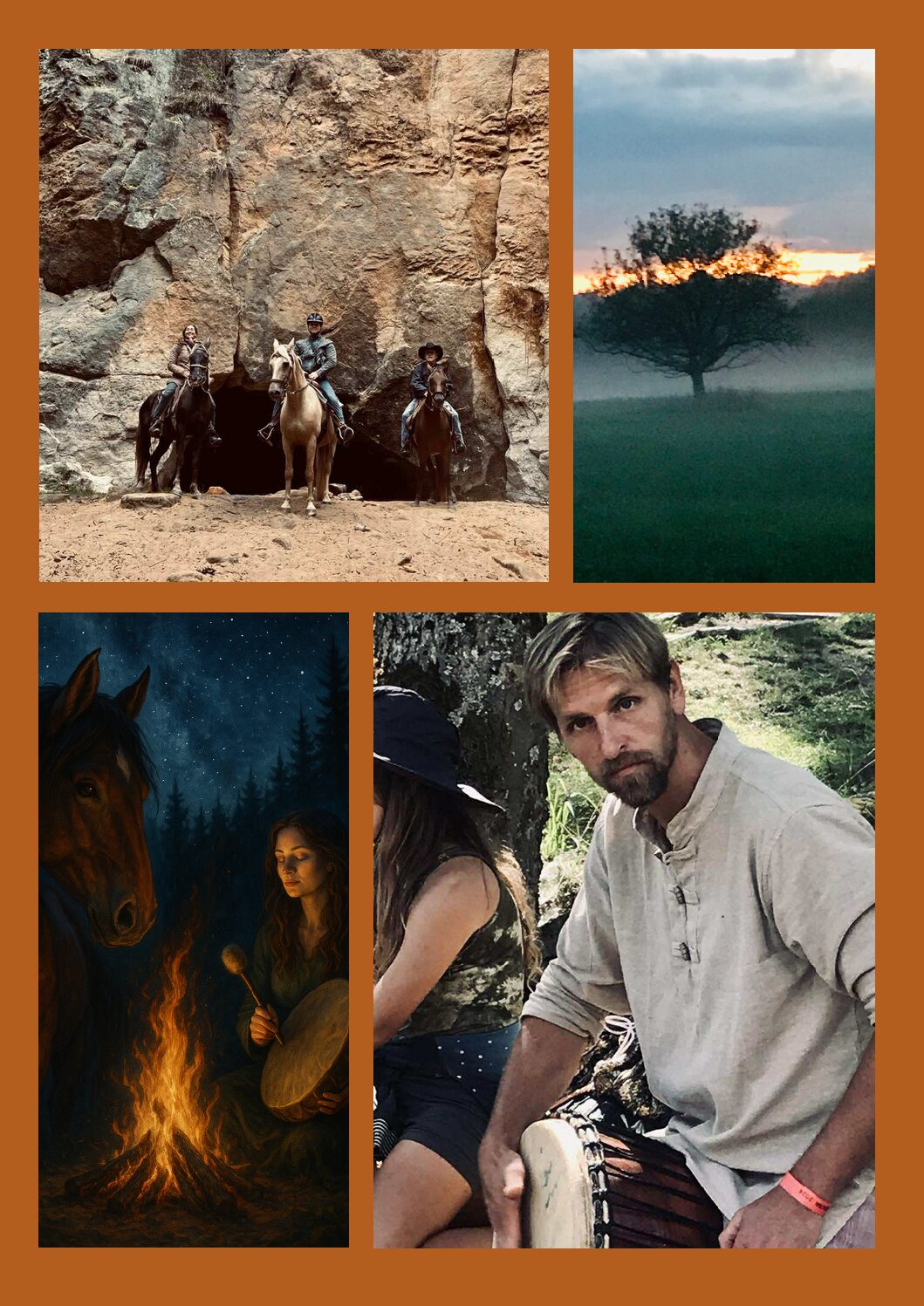 Tenhle zážitek je hlavně o léčivém rytmu  a pohledu do sebe...První den  se dozvíte, co vám kůň o vás říká pomocí zrcadlení a naučíte se vše potřebné pro výlet v sedle. Druhý den  splynete s rytmem koňského kroku a cvalu na tříhodinovém výletě . Čeká vás putování krajinou, která umí otevřít vaše vnímání a naladit vás na váš vnitřní hlas. Večer  vás čeká táborový oheň a Ríša vás zasvětí do magie bubnování...Není to ale žádný obyčejný učitel hudby. On sám se učil přímo od afrických domorodců, kde bubnování  není jen hudbou, ale rytmem srdce. Zkusíte si nejen hru na africký buben Djembe, ale i na veliký šamanský buben, jehož hluboký rytmus může být mostem mezi světem lidí a světem přírodních sil.