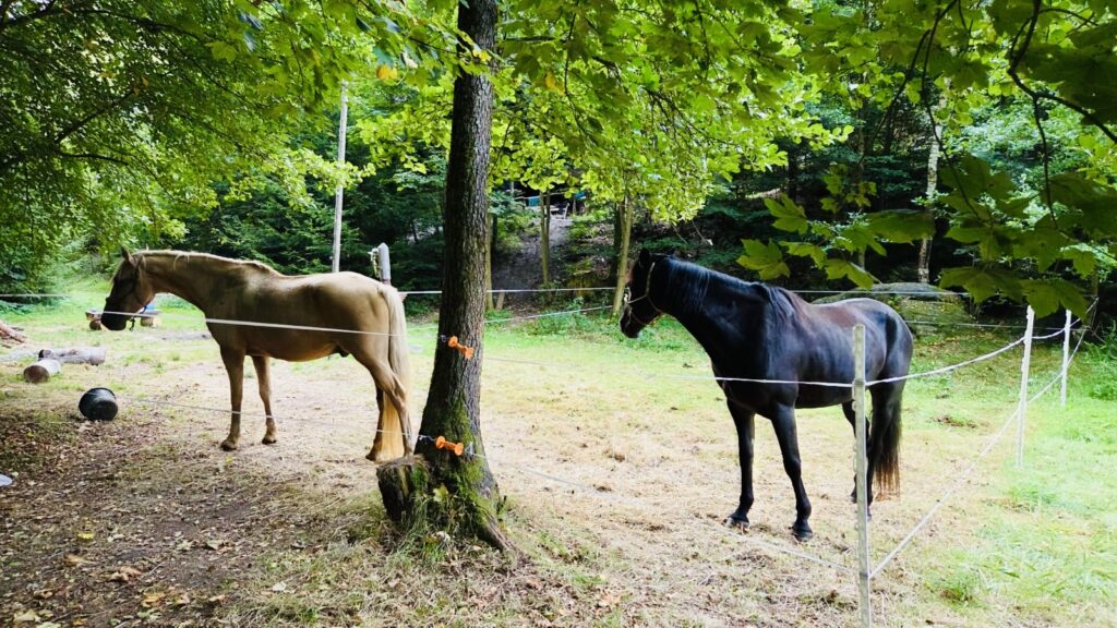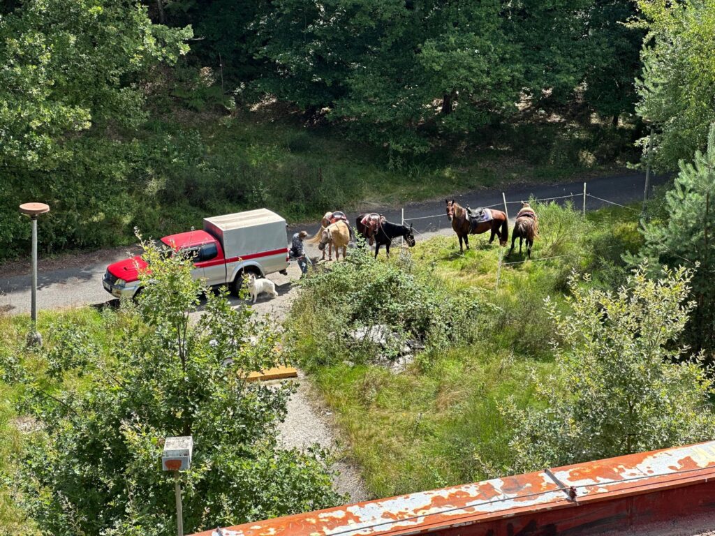 A protože do našeho „náklaďáku“ se toho dá naložit opravdu hodně, využili jsme ho k tomu, že Ríša na tato stanoviště vozí i mobilní ohradu pro koně. Tu na místě postaví vždy ještě než tam dorazíme my s koňmi. A my je do ni potom dáme a můžeme si místo prohlédnout a užít si na něm dobrodružství, aniž bychom se museli starat o koně. Ti na nás zatím čekají v ohradě a Ríša je hlídá.